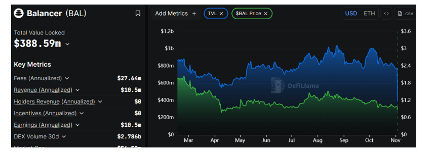 DeFiLlama에 따르면, 3 11 월 2025, Balancer '의 총 창고 볼륨 (TVL)은 약 $ 775 백만에서 $ 392 백만, 24 시간에 거의 50 퍼센트로 급격히 감소했다。