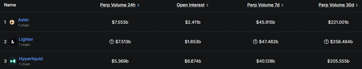 根据 DeFiLlama 最新数据,Aster 每日交易量亿超过近期发币预期最高的 Lighter,位居 Perp DEX 项目首位。
