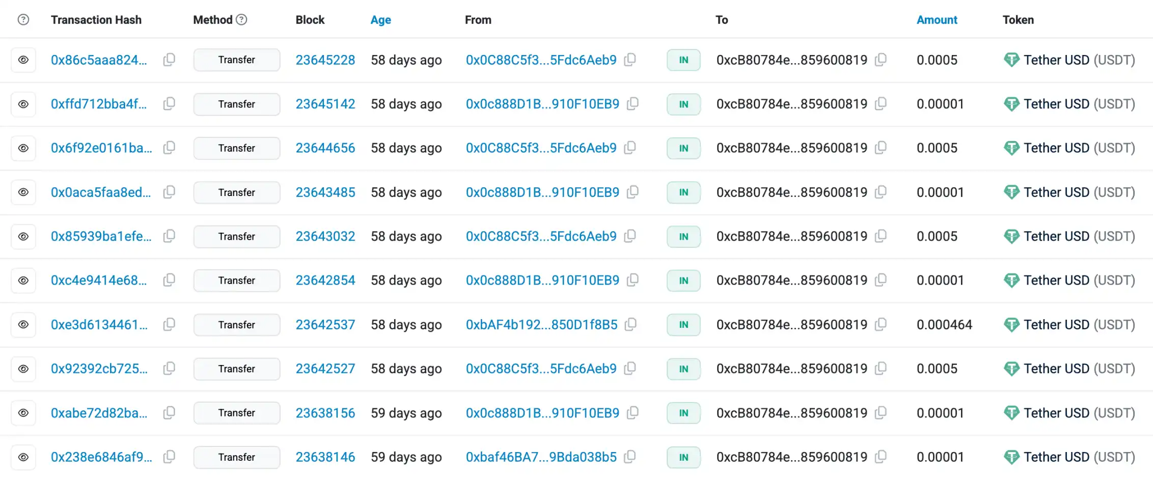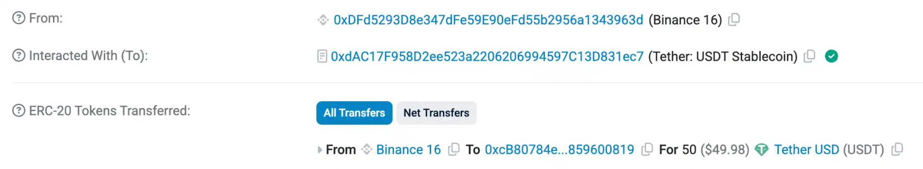 据笔者查证,该地址(0xcB80784ef74C98A89b6Ab8D96ebE890859600819)于北京时间 19 日 13 时左右从 Binance 提出 50 枚 USDT 进行了大额提币前的测试。