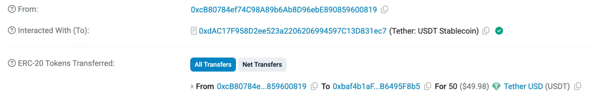 大约 20 分钟之后,收到 5000 万枚 USDT 的地址就先向 0xbaf4…95F8b5 转入 50 枚 USDT 用于测试。