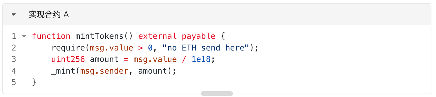 1. Pada tes Sepolia Ether, proyektor (EOA) mengirimkan realisasi kontrak, mengasumsikan bahwa fungsi utama dari kontrak adalah untuk pengguna untuk deposit ETH untuk membuat Accounter AToseen, kode perkiraan ditampilkan dalam fungsi MintTokens. Penugasan diasumsikan menjadi A. Sangat penting untuk dicatat bahwaTIDAK ADA FUNGSI DALAM A YANG DAPAT MENGEKSTRAK ETH SECARA LANGSUNG。