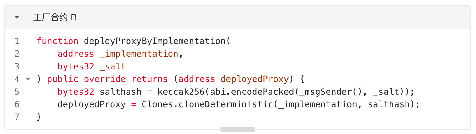 Seperti yang dapat dilihat dari fungsi cloneDeterministik, menciptakan kontrak proksi dengan cara creating2alamat dari kontrak proksi yang dibuat berhubungan dengan alamat pendiri kontrak, garam, alamat dari kontrak realisasi, kode byte tetap, dan tidak ke kode byte dari kontrak realisasi。