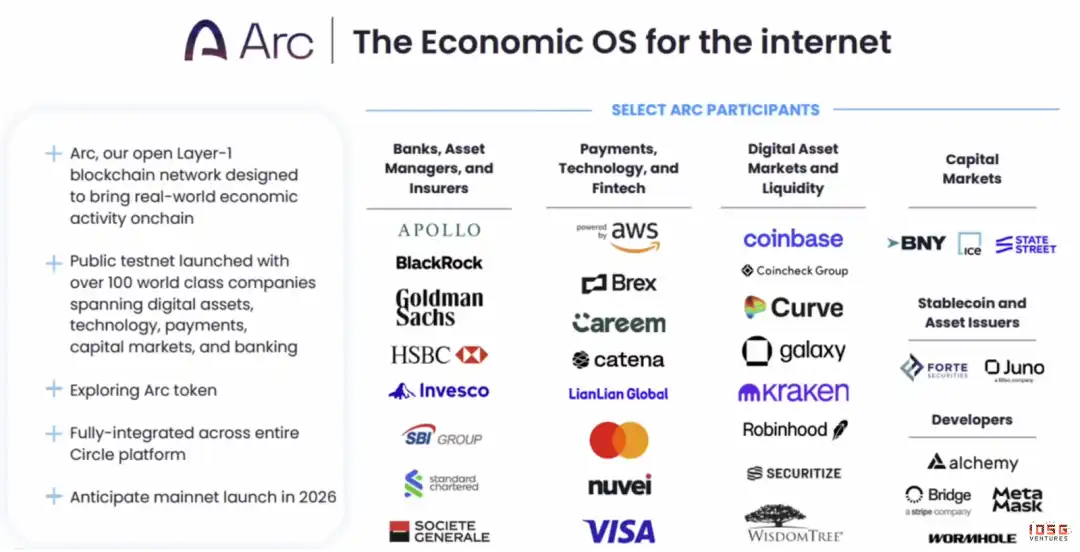 Vertical integration: trade media (USDC)+ channel (Coinbase, Visa)+ clearing layer (ARC public chain)