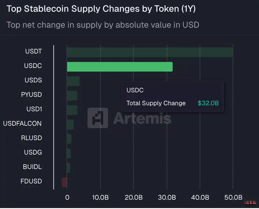 While Tether may remain dominant in offshore and emerging markets, over the past year, Circe's USDCNET SUPPLY ALSO INCREASED BY $32 BILLION, JUST $50 BILLION FROM THE USDSTI don't know。