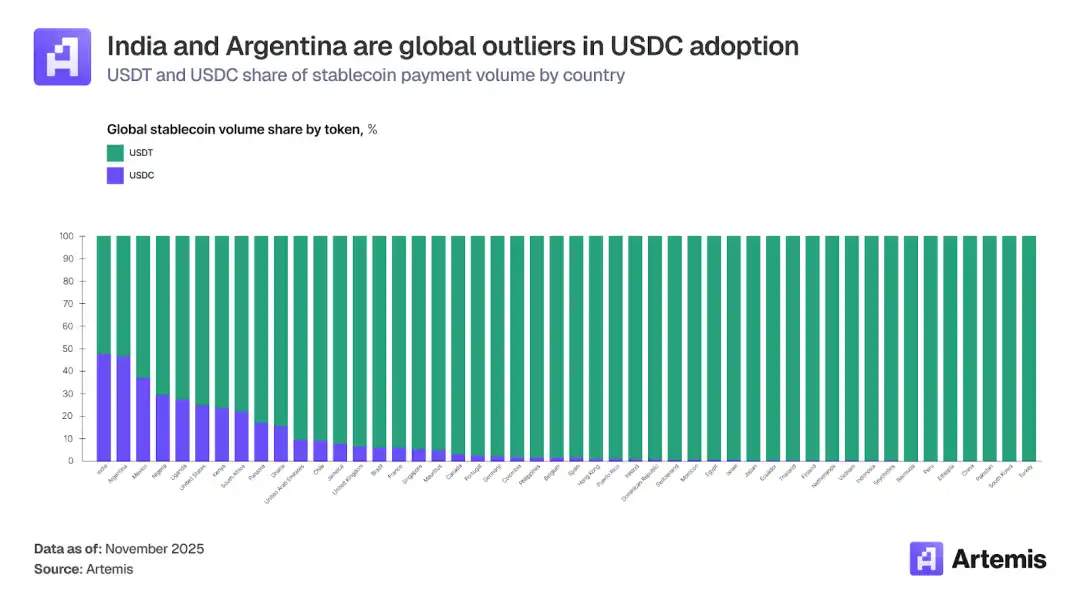 However, there has also been significant progress on the challenges of the offshore and emerging markets for Tether, with market shares reaching 48 per cent and 46.6 per cent in India and Argentina. The main reason for the increase in the position of the USDC in the offshore markets is due to the growth of encryption card operations over the past few years。