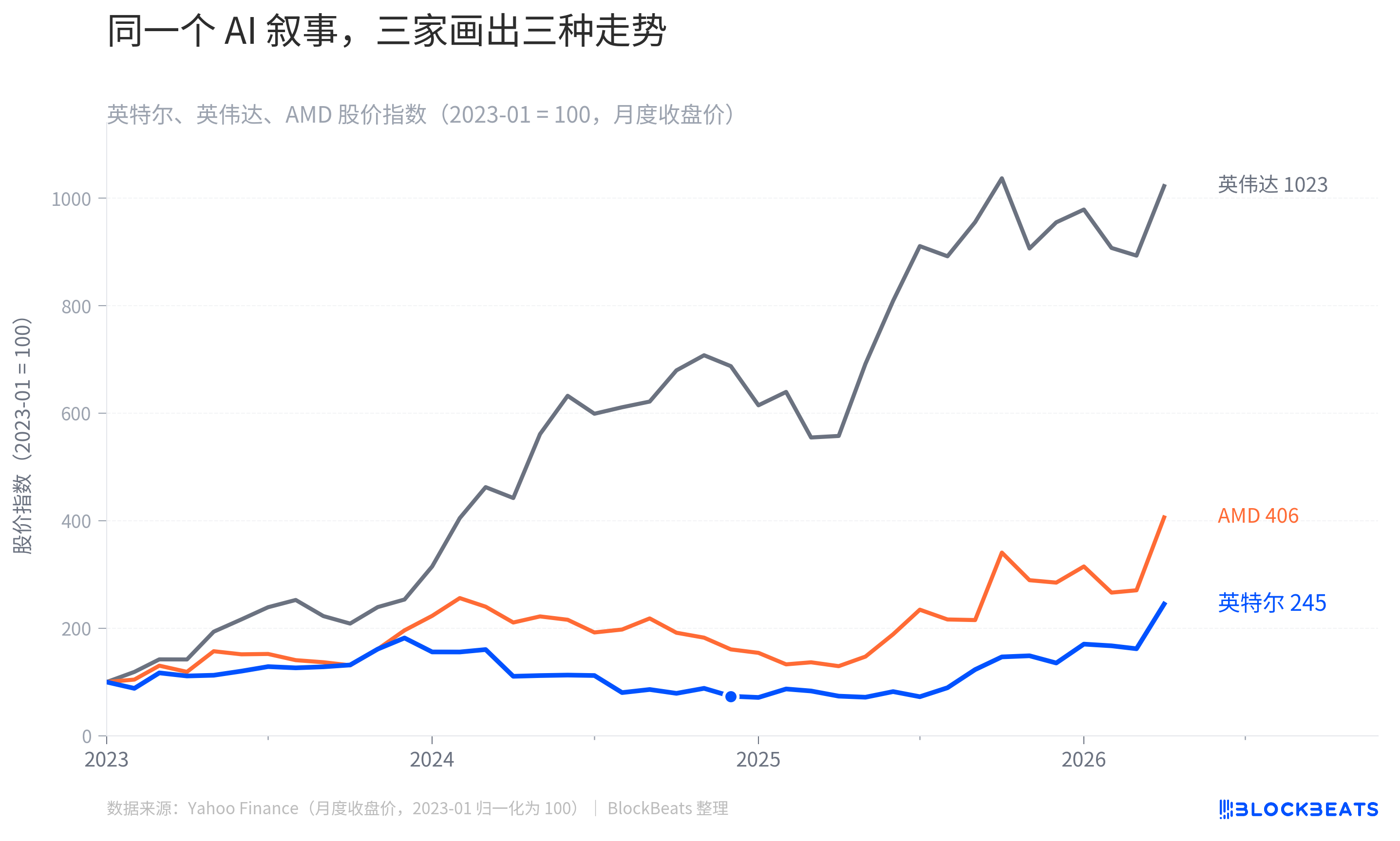 2026 โดยใช้วันที่ 2023 เป็นม้านั่ง ดัชนีราคาหุ้นอิงเวดะได้ถูกผลักดันไปที่ 1023, AMD ถึง 406 และข้อมูลข้อมูล 245. เช่น เดียว กับ สาม บรรทัด จุด จบ ต่าง กัน เกือบ ห้า เท่า. แต่ที่คุ้มค่ายิ่งกว่า คือรูปร่างของเส้นสีน้ําเงินในข้อมูล ซึ่งไม่ได้ค่อยๆไต่ขึ้น ซึ่งครั้งแรกลงไปที่ 64 ในเดือนกันยายน 2024。