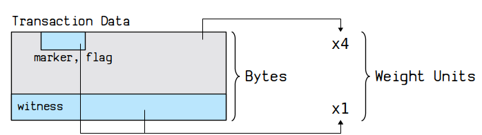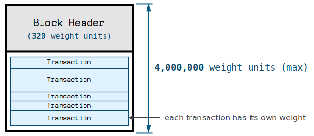虽然变相扩大了区块容量,但隔离见证也受到区块大小限制。比特币的区块大小限制为1M bytes,由于witness数据不包含在这个限制中,为了防止witness数据被滥用,仍然对总的区块大小做了限制。引入了一个新概念叫块重量(Block weight)