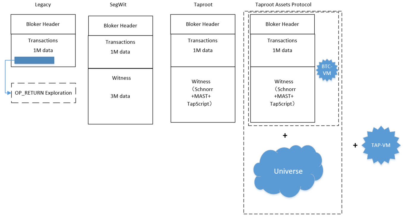 注:其实在Taproot一层,TaprootScript的能力还比较受限制,因为还需要比特币的虚拟机来支持。在隔离见证中的第三个版本中TaprootAssets协议中有专门针对TaprootScript的专用虚拟机TAP-VM,使得能力的扩充更强大,与比特币的主网运行环境隔离更好。