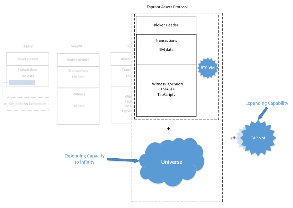 TaprootAssets协议初始阶段是主要完成了比特币的扩容,通过Univese理论上把比特币可以使用的空间扩展到了无限。TAP的VM(Taproot Asset Script v1)也有了初步的模型,重要的是产生了一个隔离的,可以独立发展的VM。在可以预见的发展后期,比特币都会在扩能方向上发展。