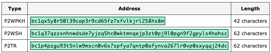 针对锁定脚本P2WPKH和P2WSH的格式如下说明,在这里也加上了隔离见证第二个版本Taproot的地址样例。