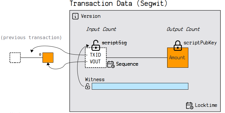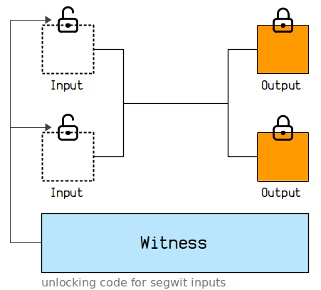 通过上图和原有的比特币交易图对比,增加了Witness部分的内容,这部分是的解锁代码。而且Witness部分的数据是存储在1M之外的扩展数据区里面。