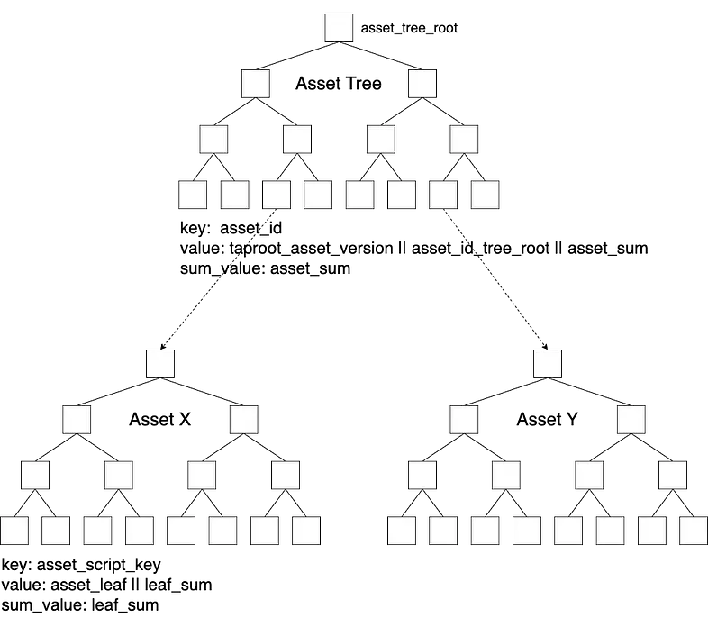 在当前的Taproot Assets协议中,使用稀疏默克尔求和树来解决资产相关的需求。