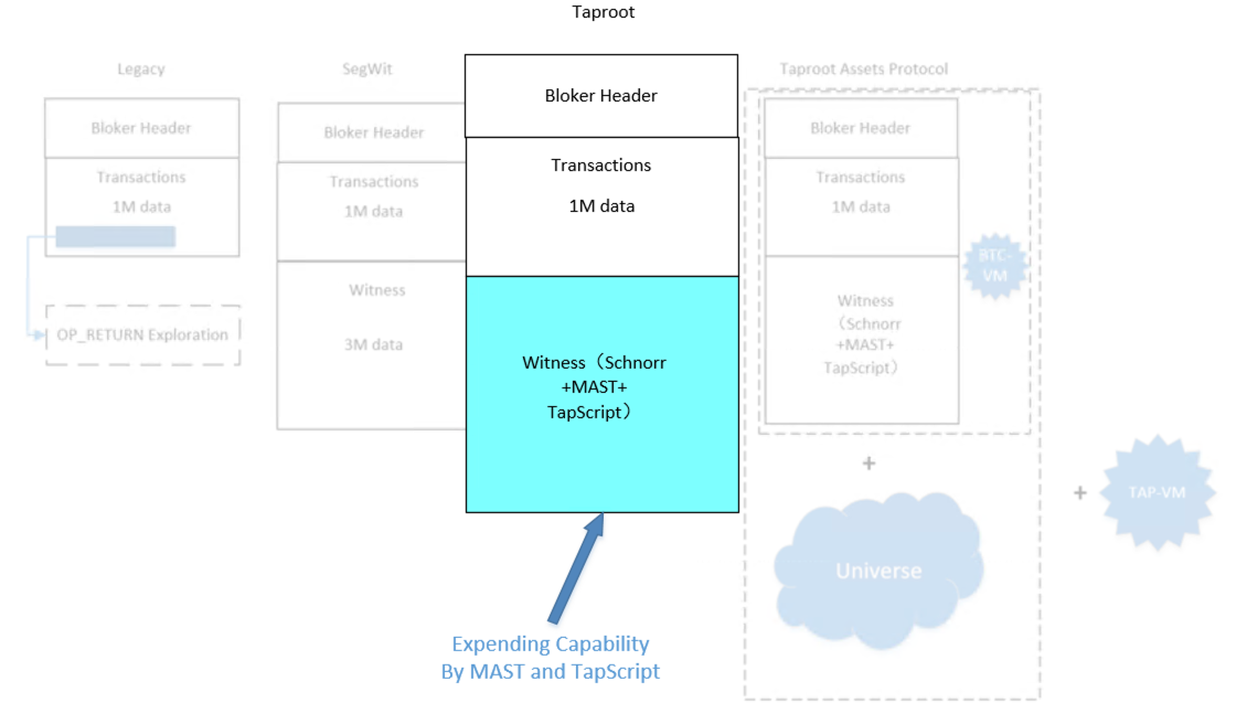 由隔离见证Segwit与Taproot的空间扩大,导致了Schnorr、MAST树和Taproot Scripts的产生,他们要完成的使命是比特币主网的功能扩大。