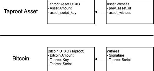 在花费一个UTXO时,首先要满足(外部的)比特币花费条件,然后是(内部的)TAP花费条件,由asset_script_key指定,并且asset_script_key应该被prev_asset_id和asset_witness满足。举个例子,asset_witness是被花费的UTXO的asset_script_key的签名。