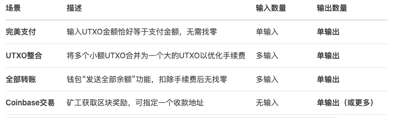 大部分交易都是2个输出,确实有只有一个输出的场景,总结如下: