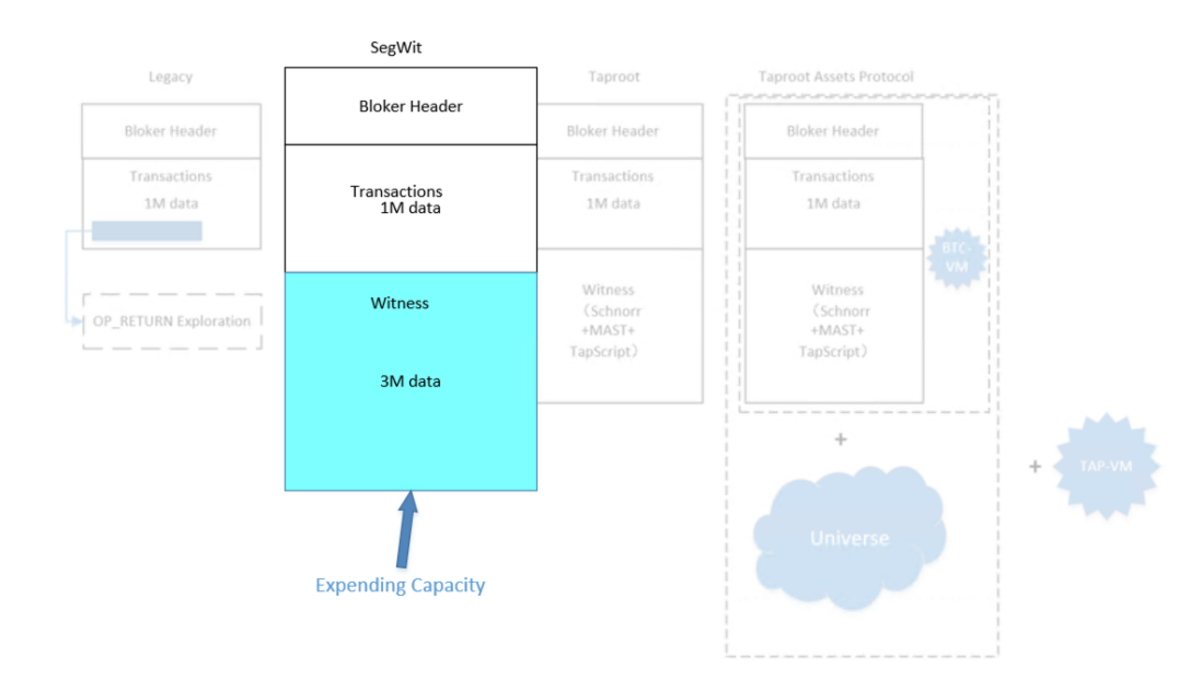 SegWit与Taproot技术完成了第一次扩容与扩能的探索,但局限在现有结构下,这种扩容和扩能都有局限性。
