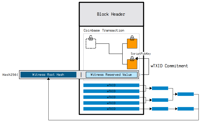 见证区中所有的交易ID(wTXID)会通过哈希树形成一个根哈希提交到coinbase中,具体值的组合见示意图。
