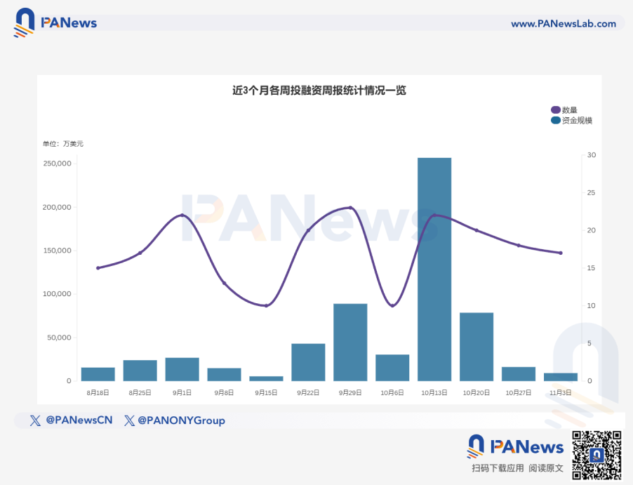 PANews指出, 據不完全的統計, 上週全球區塊鏈共有17項投資活動(10.27-11.2)
